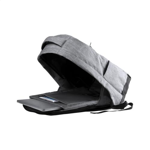 Anti-theft backpack with multiple pockets, padded laptop (15") and tablet (12") compartment, padded back and shoulder strap. With trolley strap and built-in USB connection for power banks. 300D Polyester.