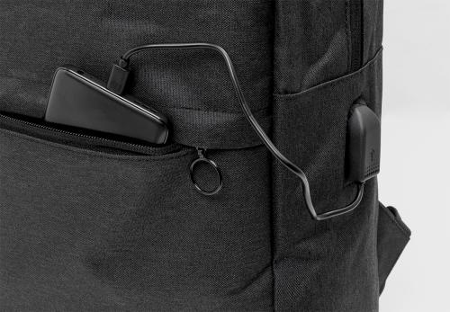 Backpack with zipped compartments, padded laptop (15") and tablet (10") compartment, padded back and shoulder straps. With distinctive RPET label and built-in USB connection for power banks. 600D RPET polyester.