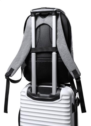 RPET backpack with zipped compartments, padded laptop (15") and tablet (12") compartment, trolley strap, ergonomic back and shoulder straps. With hidden anti-theft pocket. 600D RPET polyester.