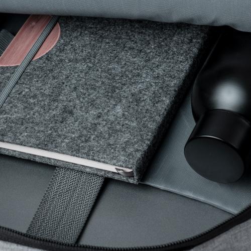 RPET backpack with zipped compartments, padded laptop (15") and tablet (10") compartment, padded back and shoulder straps. 600D RPET polyester with distinctive RPET label.