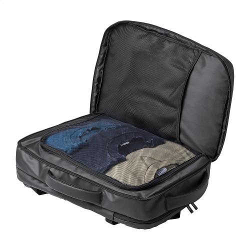 Dual function backpack and document bag in PU leather with zipped compartments, padded laptop (17") and mesh compartment, trolley strap, padded back and shoulder straps.