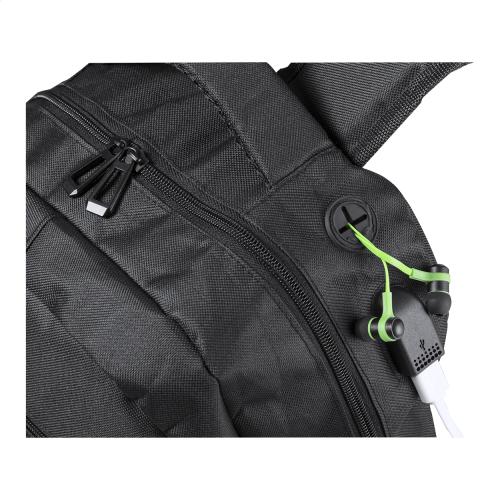 Waterproof backpack with zipped compartments, padded laptop (15") and tablet (10") compartment, padded back and shoulder strap. With earphone outlet and built-in USB connection for power banks. 600D polyester.
