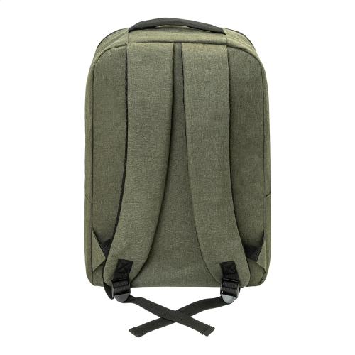 RPET backpack with zipped main compartment and 3 zipped front pockets. With padded tablet (10") and laptop compartments (15"), padded back and shoulder straps. 600D RPET polyester, with distinctive RPET label.