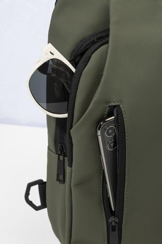 Waterproof RPET crossbody sling bag with zipped pockets, buckle closure and padded back. With adjustable shoulder strap featuring left and right side positions. PU coated 600D RPET polyester, with distinctive RPET label.