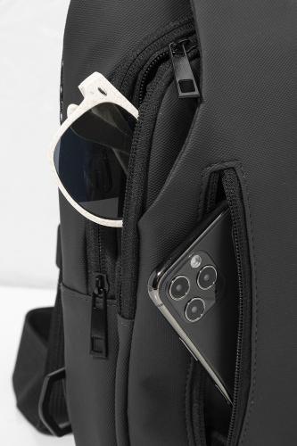 Waterproof RPET crossbody sling bag with zipped pockets, buckle closure and padded back. With adjustable shoulder strap featuring left and right side positions. PU coated 600D RPET polyester, with distinctive RPET label.