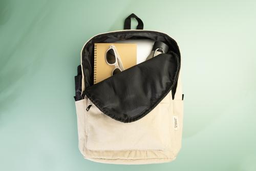 Recycled canvas backpack with zipped main compartment, padded laptop (15") compartment, 2 zipped front pocket, side pockets, trolley strap, padded back and shoulder straps. 70% recycled cotton and 30% RPET polyester. With distinctive recycled cotton label.
