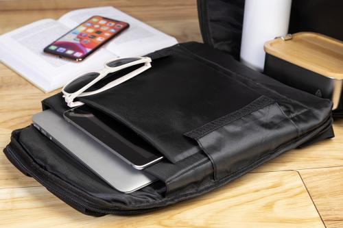 RPET anti-theft backpack with zipped compartment, padded laptop (15") and tablet (12") compartment, trolley strap, padded back and shoulder straps. With hidden anti-theft pocket. 300D RPET polyester. With distinctive RPET label.