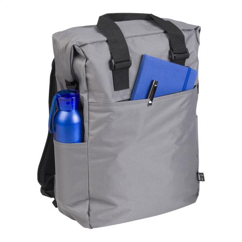 RPET backpack with zipped main compartment and front pocket, padded laptop (15") and tablet (10") compartment, side buckle straps and pockets, padded back and shoulder straps. 600D RPET polyester with distinctive RPET label.
