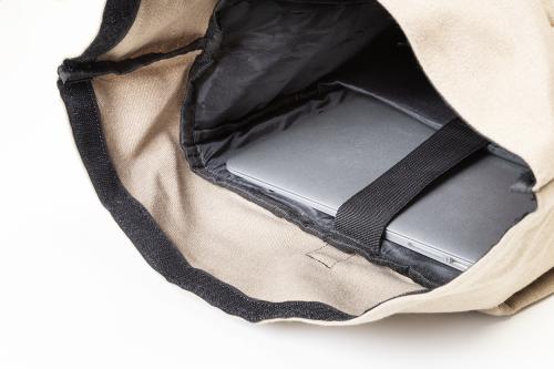 Recycled canvas rolltop backpack with buckle and velcro closure, padded laptop (15") compartment, front and side pockets. With trolley strap, padded back and shoulder straps. 70% recycled cotton and 30% RPET polyester. With distinctive recycled cotton label.