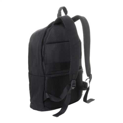 Recycled canvas backpack with zipped main compartment, padded laptop (15") compartment, zipped front pocket, side pockets, trolley strap, padded back and shoulder straps. With hidden anti-theft pocket. 70% recycled cotton and 30% RPET polyester. With distinctive recycled cotton label.