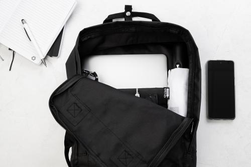 Waterproof, RPET backpack with zipped main compartment, 2 zipped front pockets, side pockets and padded laptop (15") and tablet (10") compartment. With padded back and shoulder straps. PU coated 600D RPET polyester, with distinctive RPET label.