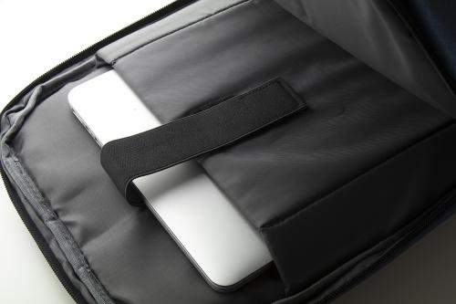 Two-tone backpack with multiple zipped compartments, inside organiser pockets, padded laptop (17") compartment, ergonomic back and shoulder straps. With anti-theft pocket, trolley strap and built-in USB connection for power banks. 400D polyester.