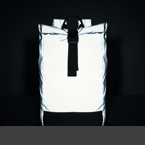 15 inch laptop rolltop backpack in high reflective 190T polyester. Additional internal side with hook and loop closure. Padded back, straps and bottom. Front sided zippered pocket. Bottom part in 600D recycled polyester.