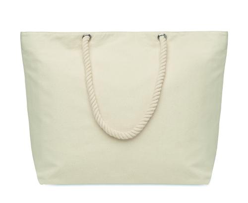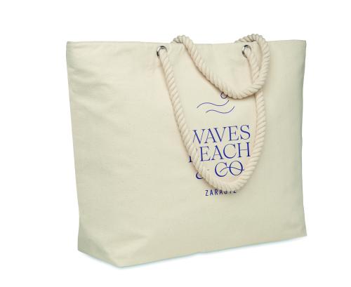 Zippered beach cooler bag in cotton with cord handle. 220 gr/m². 2mm aluminium foil insulation.