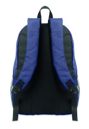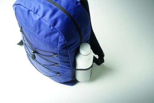 Backpack in 600D RPET polyester with decorating cord and front zippered pocket panel. Mesh pockets on both sides.