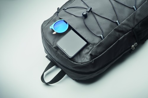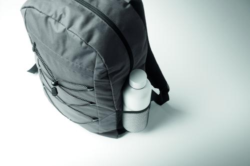 Backpack in 600D RPET polyester with decorating cord and front zippered pocket panel. Mesh pockets on both sides.