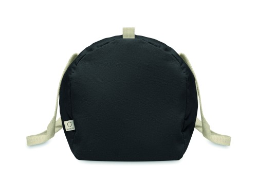 Duffle, sports or travel bag with zippered side compartment and zippered inner pocket in 320 gr/m² recycled cotton (80%) and recycled polyester (20%) with long handles.