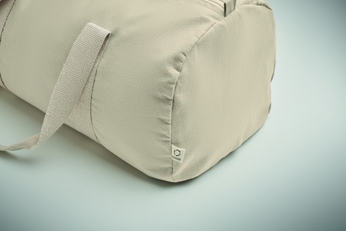 Duffle, sports or travel bag with zippered side compartment and zippered inner pocket in 320 gr/m² recycled cotton (80%) and recycled polyester (20%) with long handles.