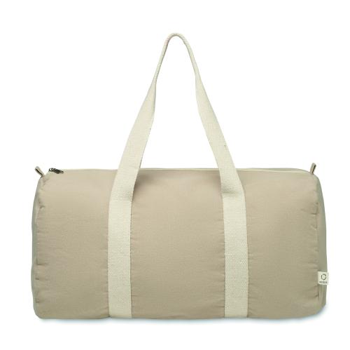 Duffle, sports or travel bag with zippered side compartment and zippered inner pocket in 320 gr/m² recycled cotton (80%) and recycled polyester (20%) with long handles.