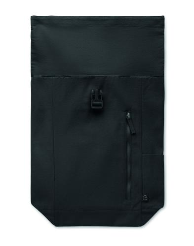 Roll top backpack with hook and loop closure in 390 gr/m² recycled cotton (80%) and recycled polyester (20%). Zippered front pocket.