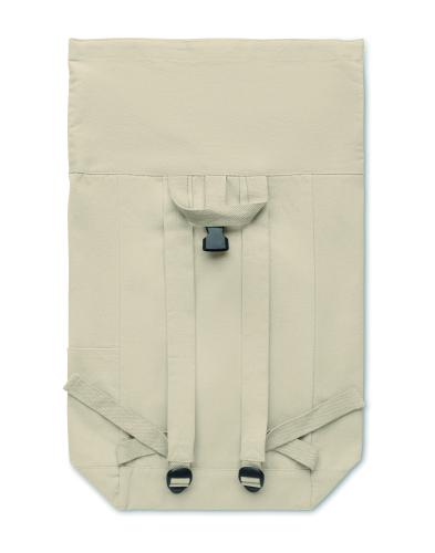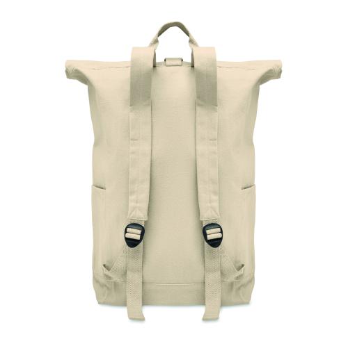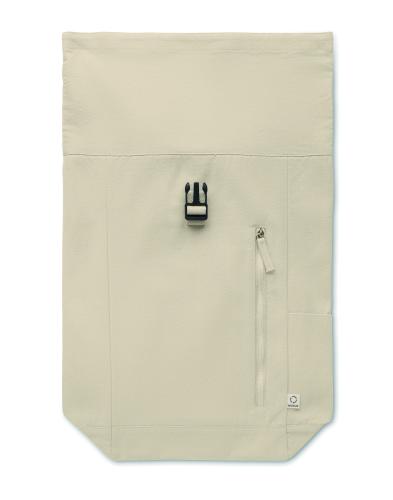 Roll top backpack with hook and loop closure in 390 gr/m² recycled cotton (80%) and recycled polyester (20%). Zippered front pocket.