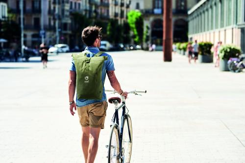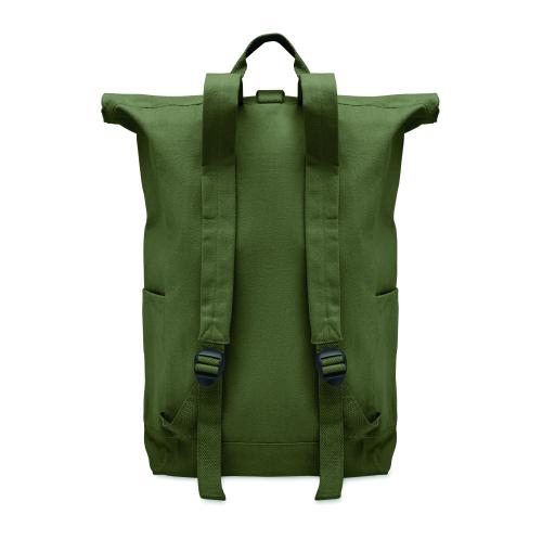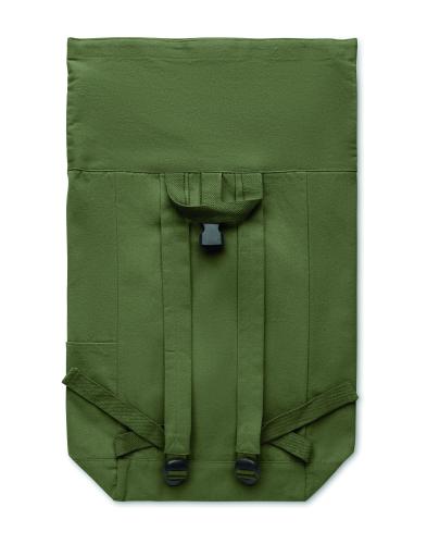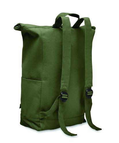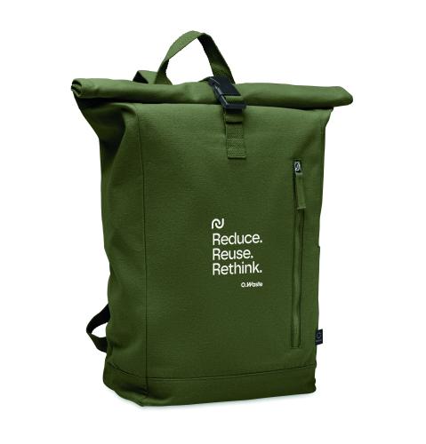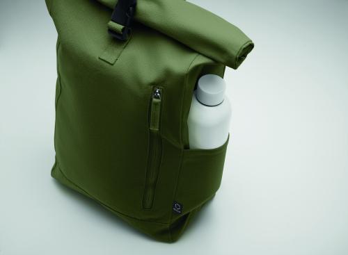 Roll top backpack with hook and loop closure in 390 gr/m² recycled cotton (80%) and recycled polyester (20%). Zippered front pocket.