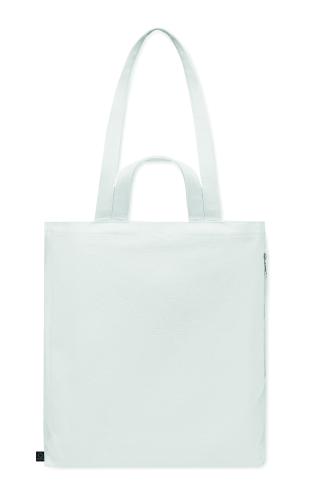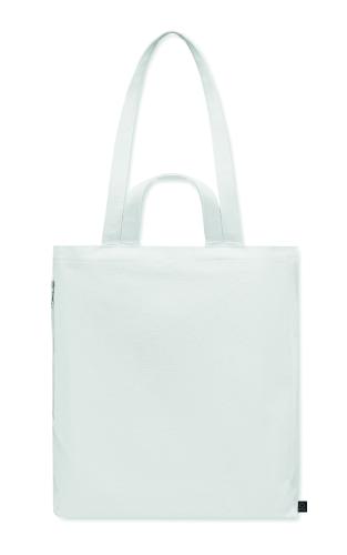 Recycled polycotton shopping or beach bag (70% recycled cotton, 30% recycled polyester) with short and long handles. It has a side zippered pocket. 380 gr/m².