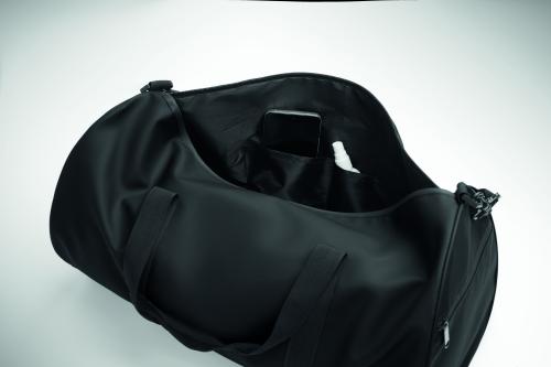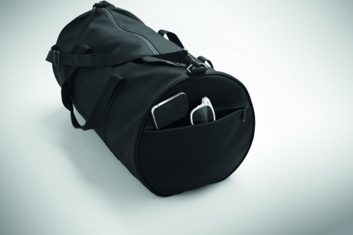 Duffle bag in 600D RPET polyester with PU coating. Front zippered pocket. Inside 210D RPET polyester lining. 1 side zippered compartment / 1 side mesh compartment. Zippered pocket inside.