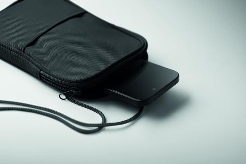 Cross body travel pouch in 600D RPET polyester and 210D RPET lining with cord strap.