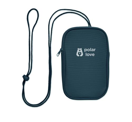 Cross body travel pouch in 600D RPET polyester and 210D RPET lining with cord strap.
