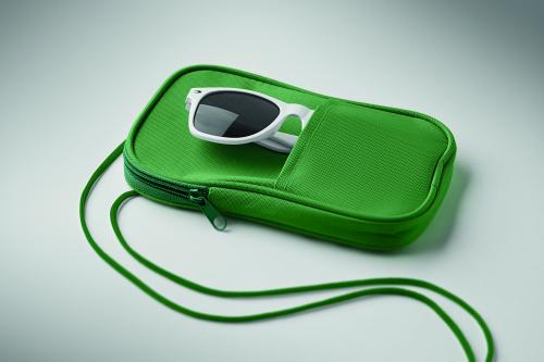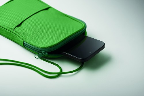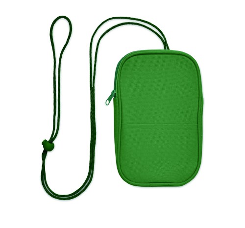 Cross body travel pouch in 600D RPET polyester and 210D RPET lining with cord strap.