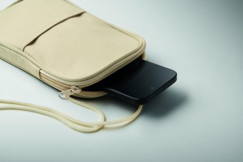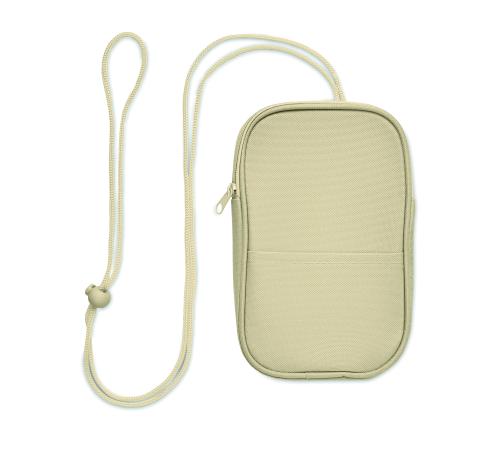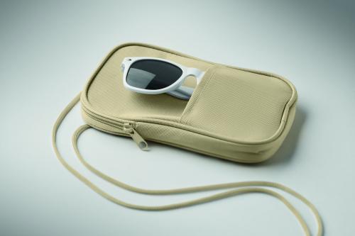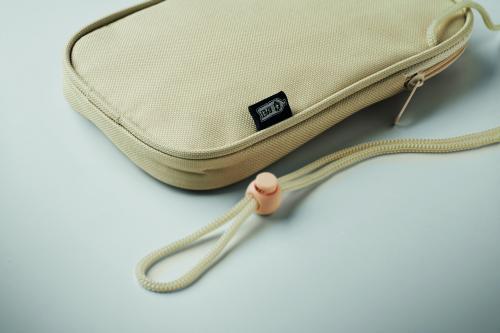 Cross body travel pouch in 600D RPET polyester and 210D RPET lining with cord strap.