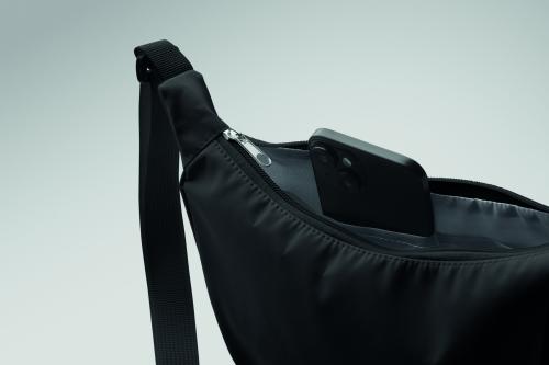 Half moon shaped cross body bag in 400D Oxford and 210D RPET lining. One main zippered pocket and 2 inside pockets.