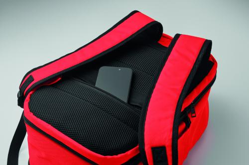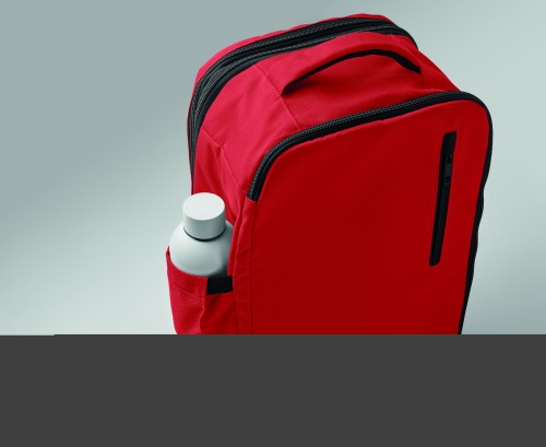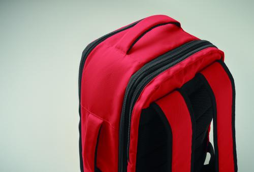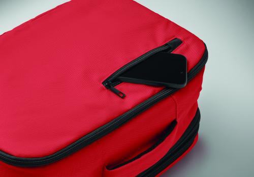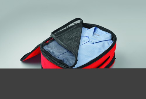 "Cabin-size carry-on extendable backpack made of 600D RPET polyester with 180o opening. Features a main compartment with two open sections, mesh division, padded 15"" laptop pocket, and luggage strap."