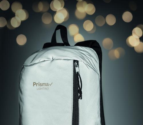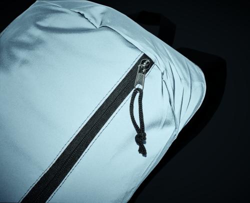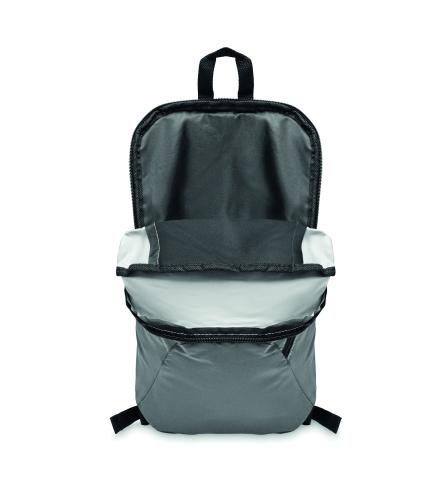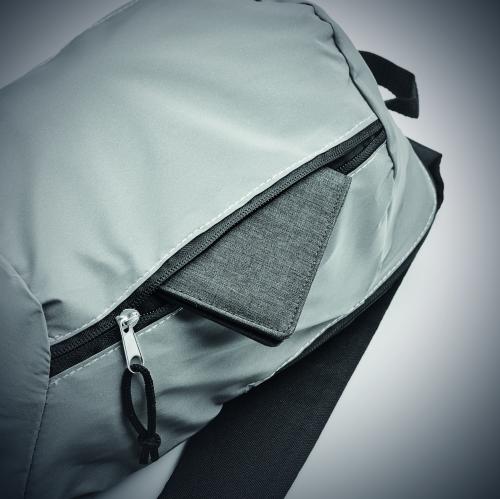 Backpack with the front in high reflective polyester with zippered outside pocket and for comfort a padded back section in 600D polyester.