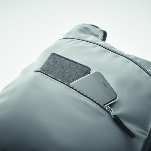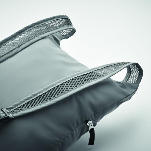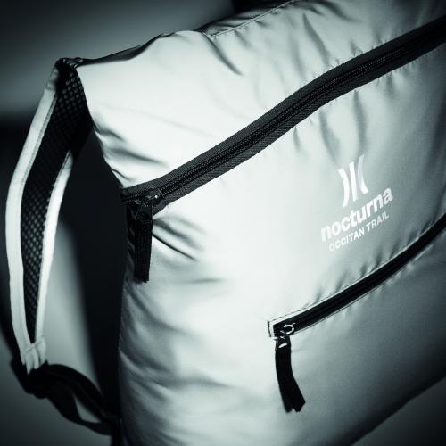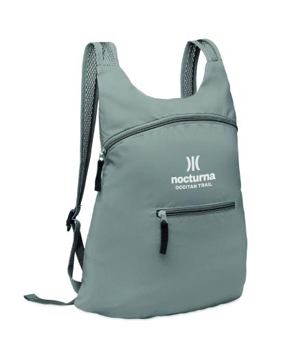 Foldable sports backpack in high reflective 190T polyester with zippered front pocket. Adjustable shoulder straps.