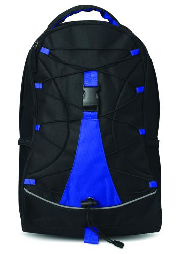Backpack in 600D polyester with colourful contrasting facing and decorating cord on the front panel. Mesh pockets on both sides.