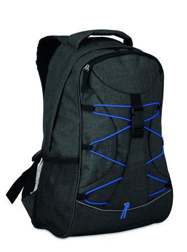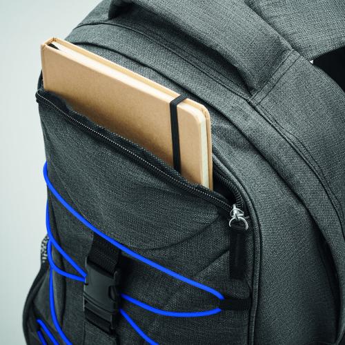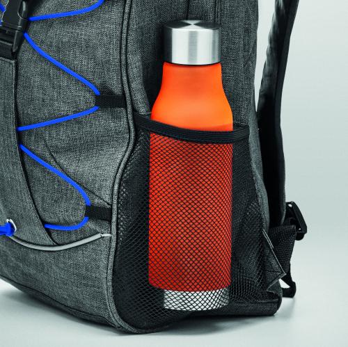 Backpack in 600D 2 tone polyester with colourful contrasting facing and glow in the dark cord on the front panel. Mesh pockets on both sides.