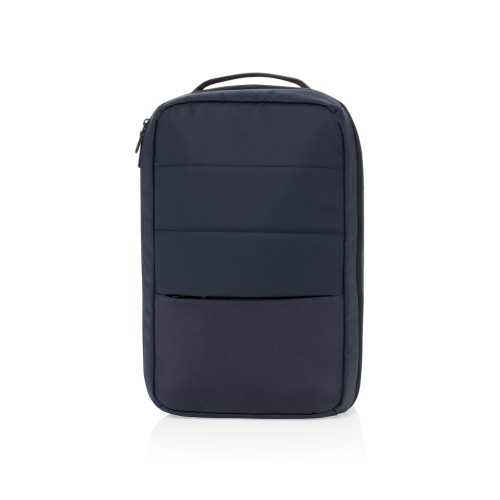 The Armond Aware™ RPET Free On Board Travel Pack is designed for the budget-conscious or short business traveller. Made from rPET with a PU water-resistant coating and backed with AWARE technology, this backpack features a 15 inch padded laptop compartment on the right side, perfect for MacBooks or smaller devices. The interior, lined with rPET, ensures your belongings stay organised, while the adjustable shoulder straps and sturdy webbing handle on top provide comfort and convenience. With a front zipper pocket and a mini trolley compartment complete with an elastic strap, this pack is perfect for business or weekend trips. Its compact size fits under any budget airline seat, so you won't have to worry about extra baggage fees. Made with recycled polyester embedded with the AWARE™ tracer. 2% of proceeds of each product sold with AWARE™ will be donated to Water.org. PVC free.