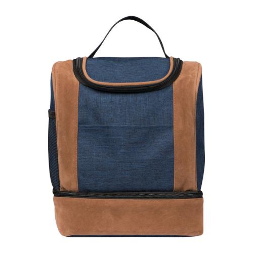 600D polyester cooler bag, with a filling capacity of 9 liters, two carrying straps, insulation, and suede-look sides and bottom.