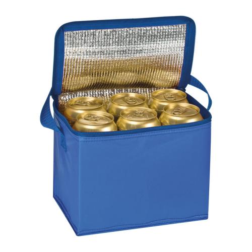 Polyester cooler bag with carrying strap, suitable for 6 standing cans with 0.5 l content.