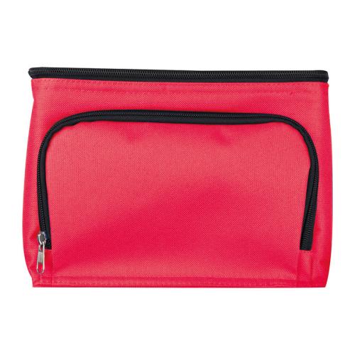 210D polyester cooler bag with a zipper front compartment and nylon carrying straps. Suitable for 6 cans with 0.5l each, small bottles or anything that needs to stay fresh.