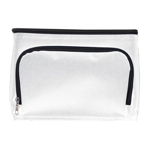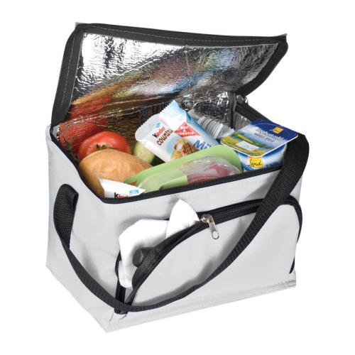 210D polyester cooler bag with a zipper front compartment and nylon carrying straps. Suitable for 6 cans with 0.5l each, small bottles or anything that needs to stay fresh.