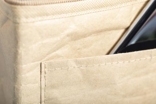 Zipped cooler bag in laminated recycled paper with aluminium padding, for 6 pcs 0,33 l cans. With front pocket ideal for printing.