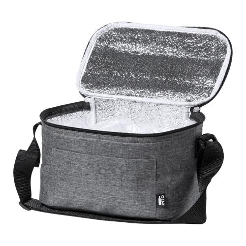 Zipped cooler bag in RPET with aluminium padding, for 6 pcs 0,33 L cans. With front pocket and adjustable shoulder strap. 600D RPET polyester with distinctive RPET label.