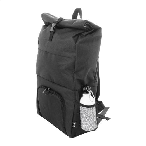 Rolltop RPET cooler backpack with zipped PEVA padded cooler compartment for lunch box. With buckle closure main compartment, zipped front pocket, side mesh pockets and padded shoulder straps. 600D RPET polyester with distinctive RPET label.