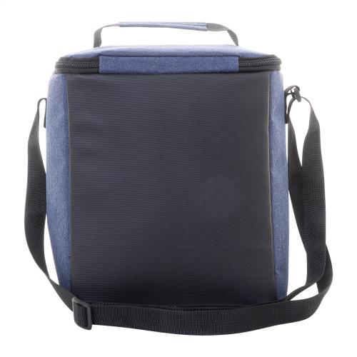 Zipped cooler bag in RPET with PU coated details and PEVA padding. With handle, adjustable shoulder strap and small front pocket. 600D RPET polyester with distinctive RPET label.