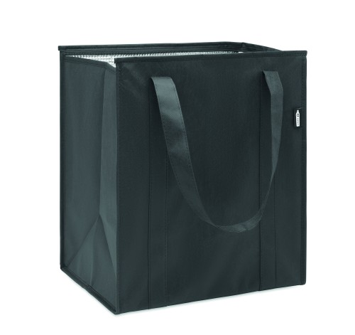 Cooler bag in RPET non-woven 80gr/m². Isolation material: aluminium foil. Capacity 25L. Main compartment with zipper on top.