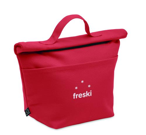 Recycled cotton (70% recycled cotton, 30% recycled polyester) insulated lunch cooler bag with rolltop hook and loop closure. Insulation: 3mm PE foam with 12C PEVA.