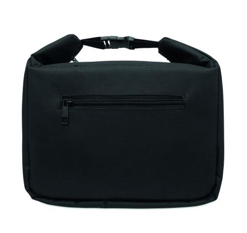 Cooler lunch bag with internal temperature indicator made of 600D RPET with 3mm PE foam with aluminium foil lining. Buckle closure. Zippered main compartment. With side zippered pocket. Capacity: 5 L